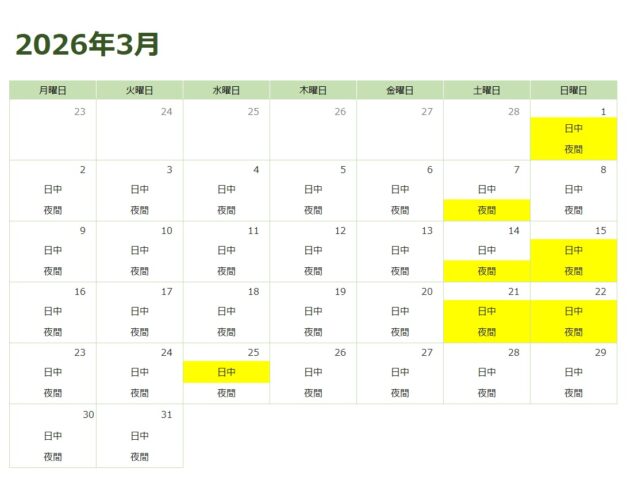 2026年 3月 無痛分娩を希望されている妊婦さんへ 2026.02.27 2026年3月 カレンダ―の黄色に塗られている時間帯は、麻酔担当医師不在のため、無痛分娩の対応ができません。 無痛分娩を希望されている妊婦さんには、ご迷惑、ご心配をお掛けし申し訳ございません。