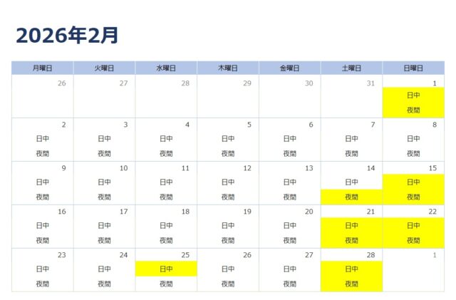 2026年 2月 無痛分娩を希望されている妊婦さんへ 2026.01.30 2026年2月 カレンダ―の黄色に塗られている時間帯は、麻酔担当医師不在のため、無痛分娩の対応ができません。 無痛分娩を希望されている妊婦さんには、ご迷惑、ご心配をお掛けし申し訳ございません。